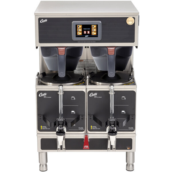 This Curtis G4GEMT10A1000 Gemini stainless steel twin satellite coffee brewer features a large 4 3/8" LCD touch screen display with programmable digital controls, so you can make sure you're delivering quality, flavorful coffee to your customers every time! With its built-in self-diagnostic system and probe sensing system for detecting lime buildup inside the water tank, this unit is engineered to alert you when it needs preventative maintenance. It's perfect for coffee shops, hotels, diners, and cafes!
