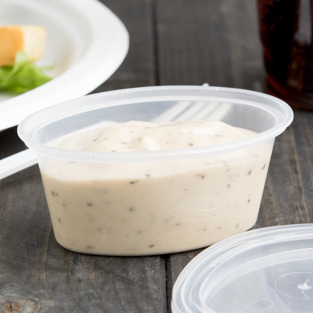 Useful for controlling portions sizes and costs, this souffle cup is great for holding a variety of items such as salad dressings, condiments, sauces, or samples. Plus the lid protects contents with it's secure fitting design. The oval shape provides a wider opening than traditional circular cups, making it easier to pour sauces or dip food. It's the perfect-sized cup for a variety of uses and comes at a budget friendly price for your business!