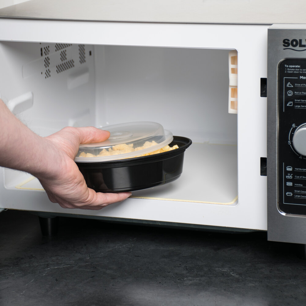 This Newspring OC-16-B 16 oz. black 6 3/4" x 4 3/4" x 1 7/8" VERSAtainer oval microwavable container with lid includes a clear, tight-fitting lid for optimal product visibility and protection from messes and spills. Its 16 oz. capacity makes it perfect for salads, pastas, and entrees, and its flat top and bottom ensures easy stacking in to-go bags. Use it for packaging food at your kiosk, food truck, convenience store, or casual restaurant!