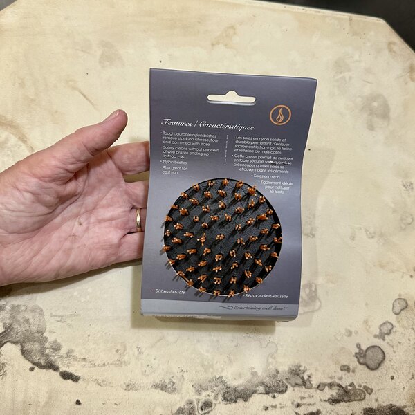I used this brush to get stuck-on fried food off my cast-iron pan. Also, it has been useful in getting baked-on pizza crust off the stone.