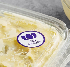 This label helps prevent cross-contamination and promotes optimal food safety for customers with allergies or specific dietary requirements. It allows you to maintain reliable, quick, and simple organization for your business. The purple color readily alerts customers to the fact that a food item contains a specific allergen.