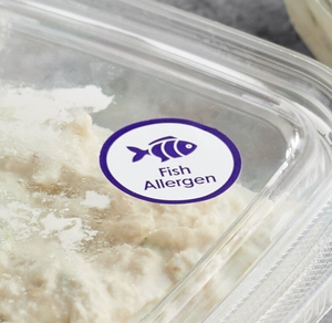 Its "fish allergen" message and matching graphic are perfect for clearly identifying food items that contain fish, such as caesar salad dressing, sushi, ceviche, or soups made with fish sauce.