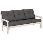 Give guests a charming, comfortable spot to sit together with this POLYWOOD Vineyard GN69SA-145986 Sand / Ash Charcoal deep seating sofa. This sofa features simple, classic styling and provides an easy way to enhance and attract guests to any outdoor space. To ensure optimal comfort for your guests, the sofa features an extra-deep seat, ample armrests, a gently reclined back rest, and thick Ash Charcoal cushions. This piece is stylish, durable, and stable with two pairs of center legs adding additional support. The sofa frame is made from renowned POLYWOOD lumber slats which provide the look of painted wood, but without any of the upkeep that is required of real wood. For incredible durability and equally low maintenance, this lumber won't splinter, crack, chip, peel, or rot and you never have to worry about painting, staining, or waterproofing it.