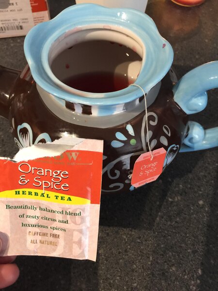 The Bigelow orange and spice herb tea is great and very relaxing. A great seasonal taste that is bursting with a great citrusy flavor with great spice hints. A nice buy.