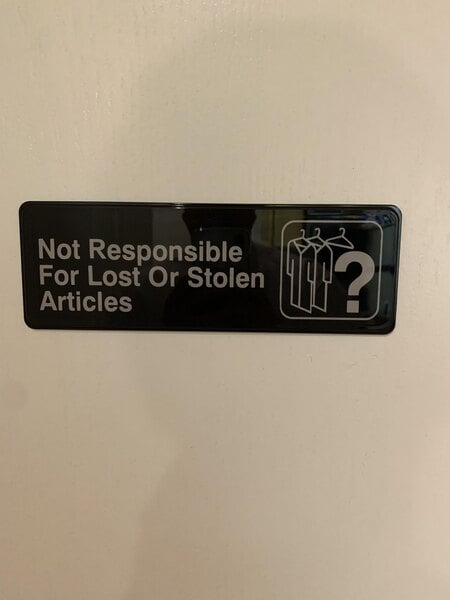 This is a nice sign for clubs or bars to have! It covers liability of lost or stolen items! Easy to read and perfect to post in self serve coat rooms!!