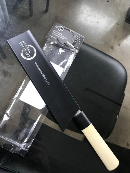 I used this for my carving knife. I enjoy using the Mercer blade guards because they don’t take up any extra space. My knives fit so perfect in my bag with these covering my knifes so I can safely take any knife out of my bag and it also keeps my knifes edges from getting banged up.