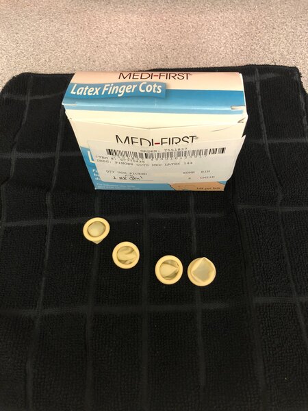 These latex finger cots are perfect to put in first aid kit for employee cuts. They keep the bandaid on finger and prevent contamination. Would recommend.