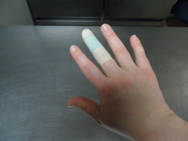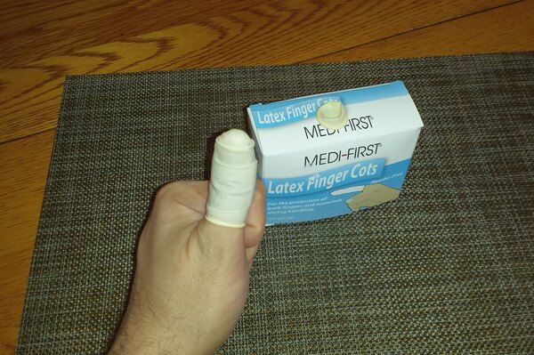 The medi-first latex finger cots are perfect for making sure you aren't contaminating your food with an open wound. We have these in our first aid kit.