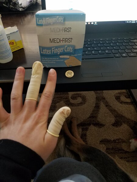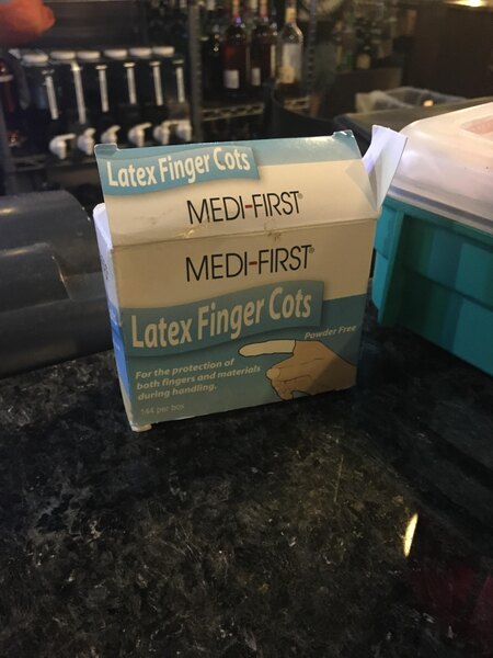 Quality finger cots. You need to have these in a commercial kitchen. These and gloves. If someone has a wound, even with a bandage over it, they need that covered by something like this and then that needs to be covered with a glove. Or two gloves. Keep these on hand. They're cheap and effective.
