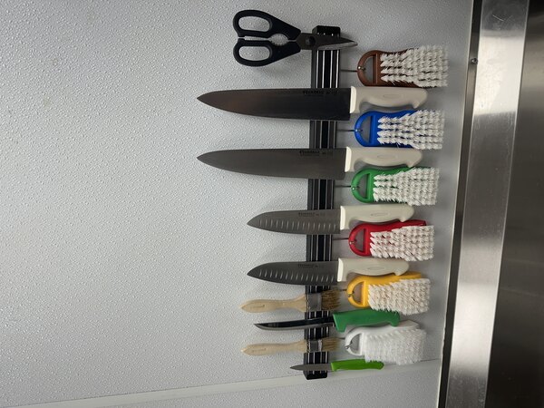 This space-saving product allows you to store your knives directly on the wall, freeing up valuable storage in your drawers and on your countertops. The magnetic knife holder offers easy access to your knives, helping your staff quickly identify which knife is right for the job and easily pull it off the wall.