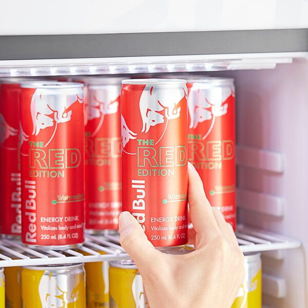 This energy drink comes in (2) 24-packs of 8.4 fl. oz. cans (48 cans total) to keep your establishment in good supply of this popular beverage. With its sweet watermelon flavor, Red Bull not only quenches thirst but also gives individuals an energizing lift. Each can features 80 mg of caffeine for the boost your customers need.