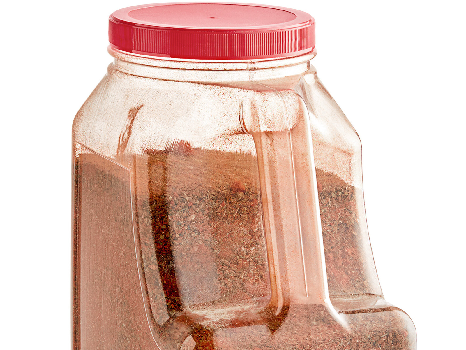 This shelf-stable spice is packaged in a handy 3 lb. plastic container with a convenient handle. This makes it extremely easy for chefs to measure out the perfect amount of seasoning for any large batch recipes.