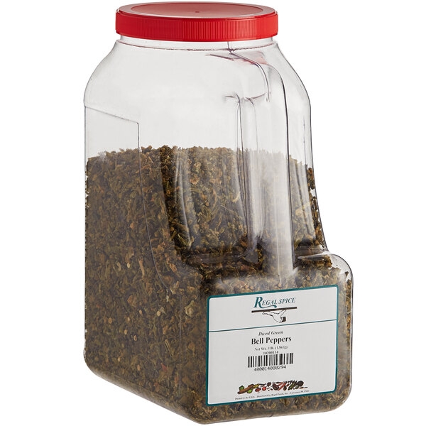 These bell peppers create a bright, mild, and slightly bitter flavor profile to meals, while adding a beautiful pop of a vibrant green color. They're diced cut and dehydrated from real, fresh bell peppers, maintaining the nutrition benefits, flavor, and desirable green color. These premium Regal green bell peppers come in a 3 lb. container to provide an amazing value for busy, high-volume kitchens. Dehydrated spices also last longer than fresh ingredients and are easier to store. Plus, as it's already diced cut, you can save valuable time on preparation before service and money on labor cost.