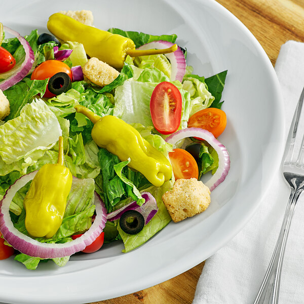 Also known as Tuscan peppers from the Tuscan region of Italy, pepperoncini is sure to add a pop of tangy, tasty flavor to any authentic Italian entree or appetizer. Create classic Greek salads with pepperoncini, tomatoes, olives, and feta cheese, or try adding them to Italian roast beef sandwiches or kebabs for a crisp, zesty taste. Pepperoncini is an eye-catching garnish that lends texture and a pop of color to your fresh deli sandwiches, salad bar offerings, or nacho toppings.