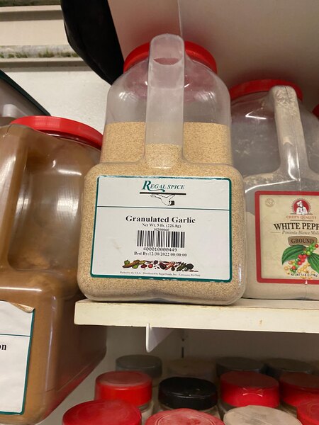 The regal granulated Garlic is a wonderful product. there are endless possibilities as to what you can add this spice to. And the 5 lb container is perfect. you can get so many uses with the large container and it is used very often.