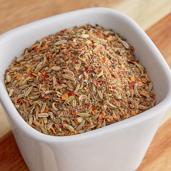 Making your own sausage is a great way to treat your guests to the freshest possible menu items with great taste. Made with a classic blend of salt, fennel, hot pepper, and other traditional herbs and spices, this seasoning contains everything you need to season your sausages to perfection. It can be used to flavor loose sausage that's perfect for tossing into spicy pasta dishes or topping pizza, or you can use it in your homemade sausage links.
