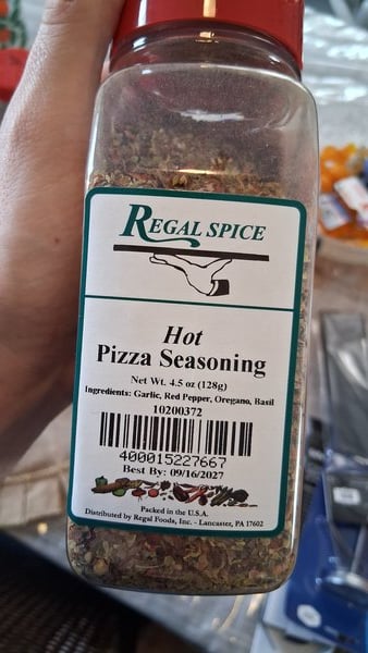Extremely flavorful pizza seasoning. Easy to use and dispense with the container this comes in. Smells great and tastes even better. Works well on other foods besides pizza.