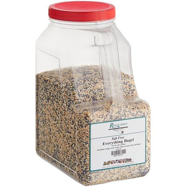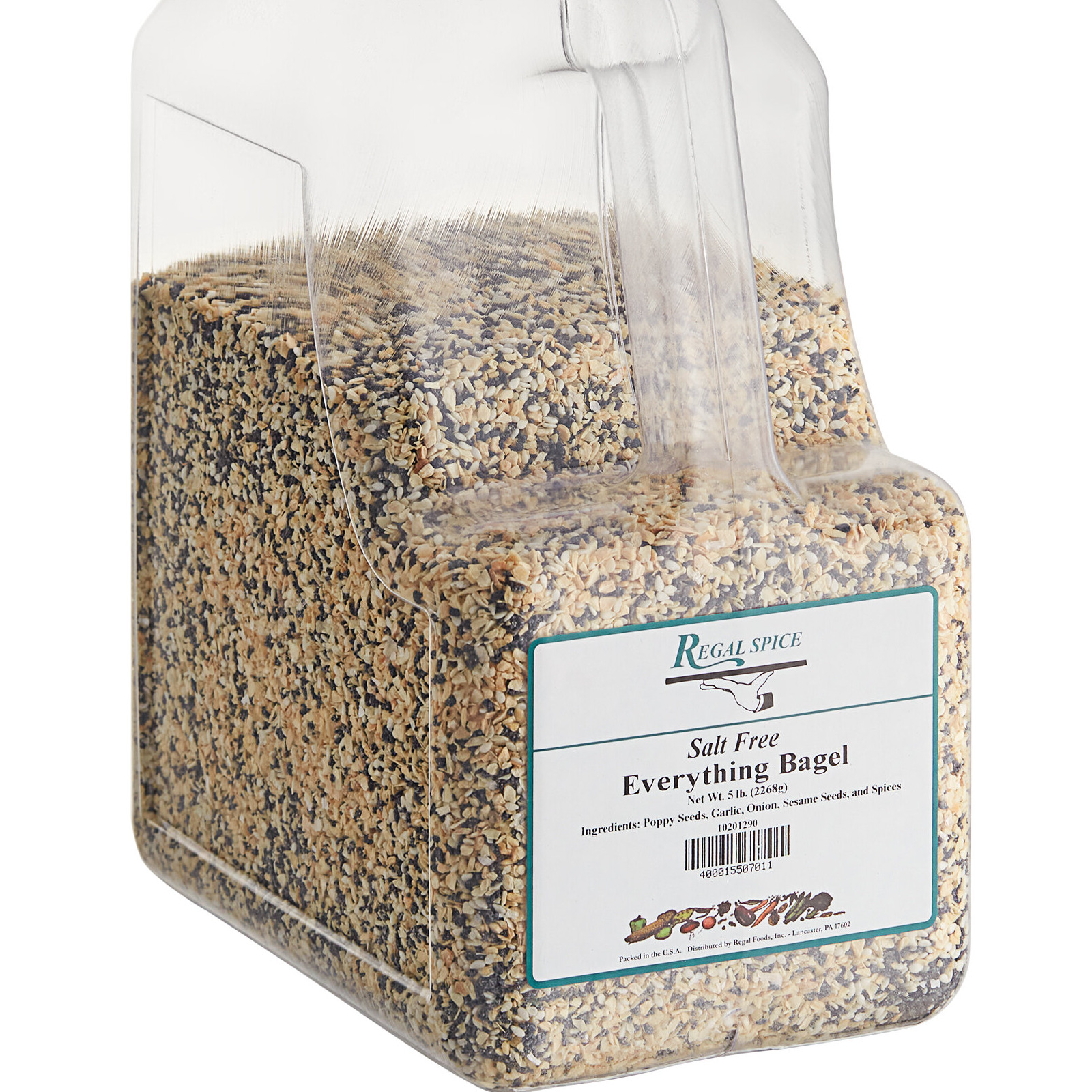 Use this pre-blended Regal salt-free everything bagel seasoning to create flavorful everything bagels with the perfect ratios of ingredients! This product is packaged in a handy 5 lb. plastic container with a convenient handle that makes it easy for chefs to measure out the perfect amount of seasoning for large batch recipes.