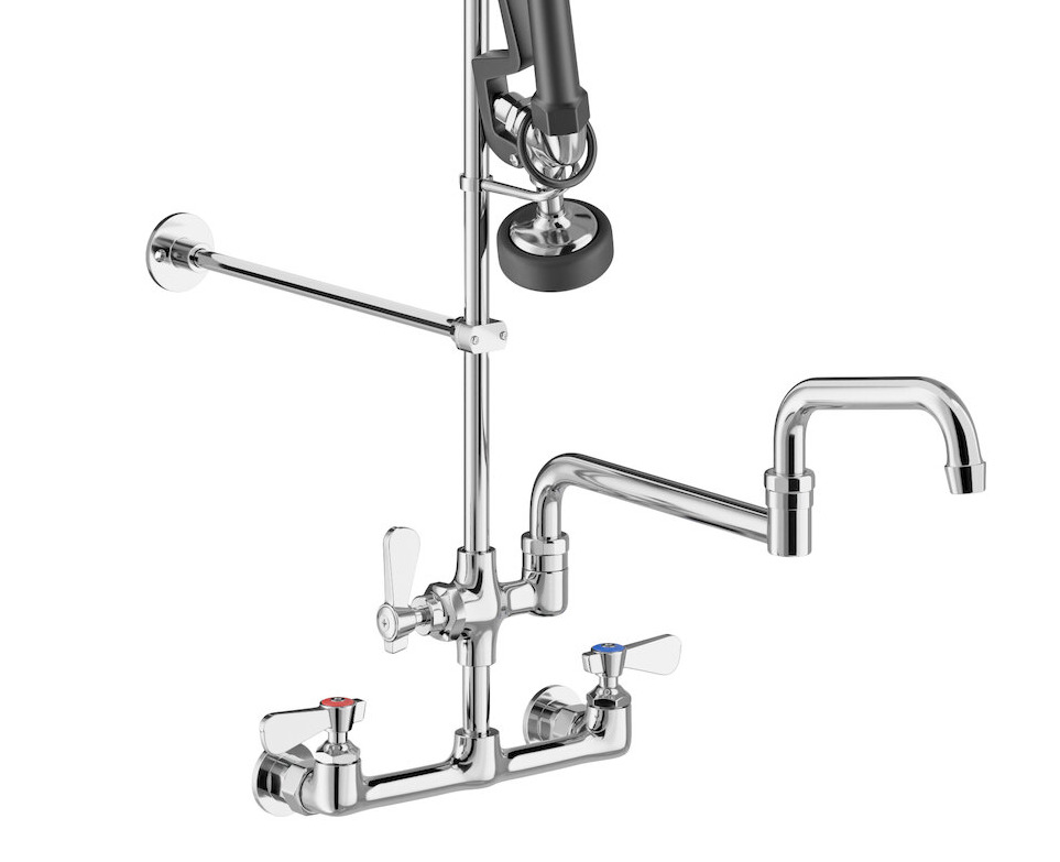 Regency 1.15 GPM Wall-Mounted Pre-Rinse Faucet with 8" Centers and 15" Double-Jointed Add-On Faucet