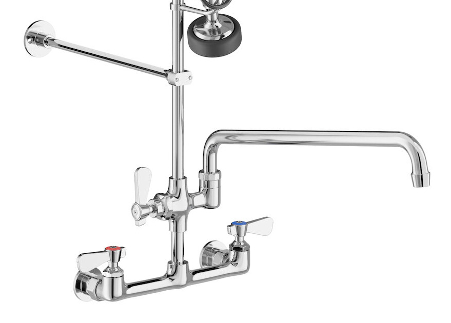 Pre-rinse faucets with a riser may include a wall bracket to help use the wall for added stability. Pre-rinse faucets without a riser will generally not include or need a wall bracket.