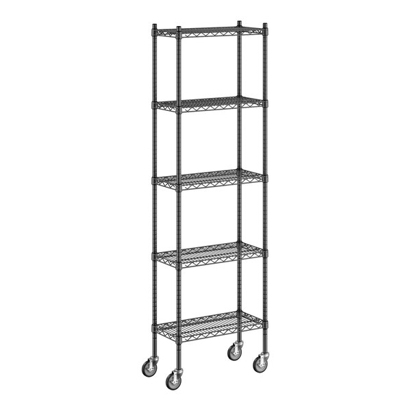 Organize your storage area with this Regency 12" wide NSF black epoxy mobile wire shelving starter kit with 5 shelves and 74" posts.