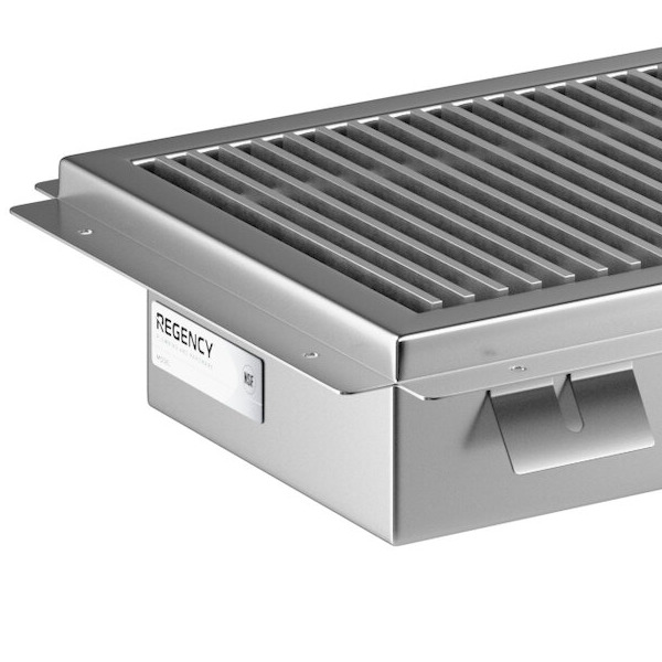 This Regency floor trough comes with a removable 3/16" x 1" subway-style grating that boasts an even 9/16" spacing between each bar. This spacing permits fluids to easily flow through, and it blocks potential clogs while enabling equipment and casters to roll over the trough without getting stuck. Plus, this item was constructed with a convenient creased design to ensure proper draining into its 3" long plumbing sleeve, which accommodates waste pipes up to 4" in diameter.