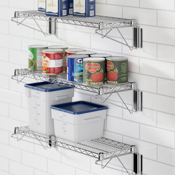 For reliable and convenient wall-mount storage, this Regency wire shelf is an excellent choice! Perfect for a variety of commercial applications, it features a stainless steel construction with a sleek chrome finish, making it suitable for dry environments.