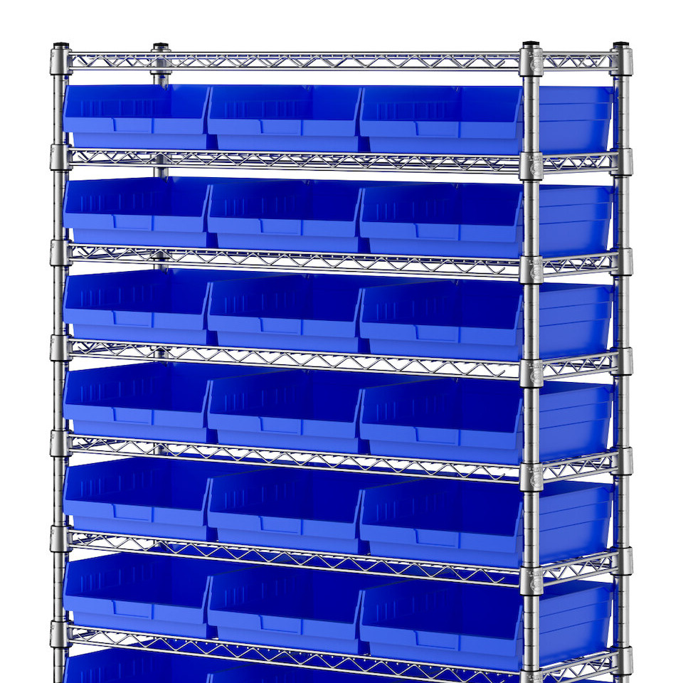 - Includes 12 shelves, 4 posts, and 33 blue polypropylene bins