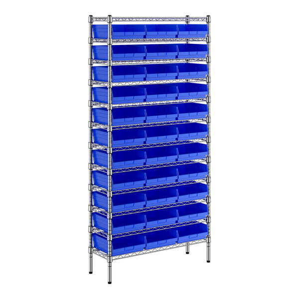 View All ItemsMaintain an organized industrial space with this Regency 12" x 36" x 74" wire shelving unit with 33 blue bins.