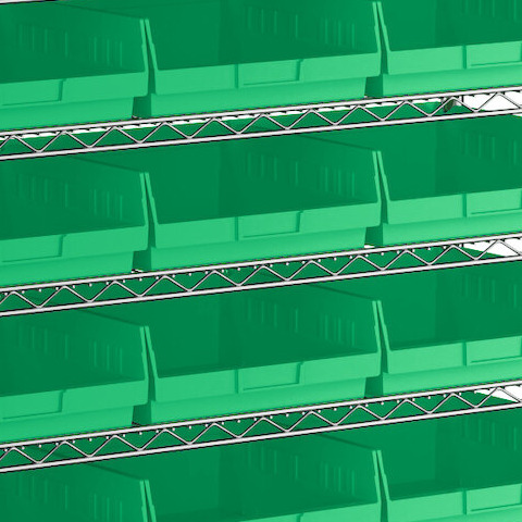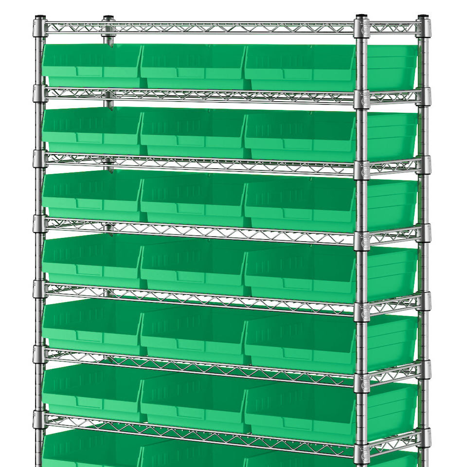 - Includes 12 shelves, 4 posts, and 33 green polypropylene bins