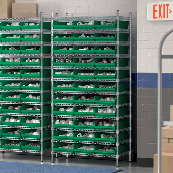 The NSF shelving unit is made of a durable, chrome-plated metal with a clear epoxy coating. It includes 12 shelves, 4 posts, and 33 green injection-molded polypropylene bins, all of which are made to commercial-grade specifications to withstand industrial conditions and for your business's long-lasting use. Each shelf can hold up to an impressive 600 lb. of evenly distributed weight.