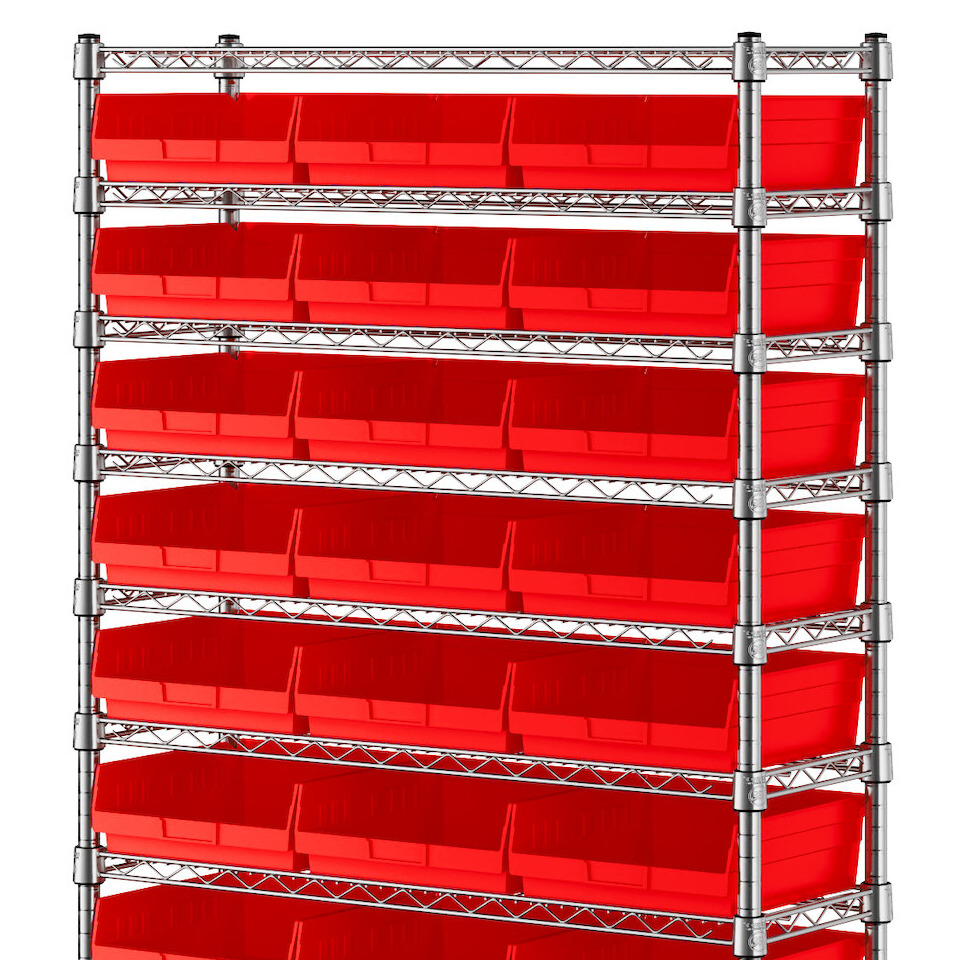 - Includes 12 shelves, 4 posts, and 33 red polypropylene bins