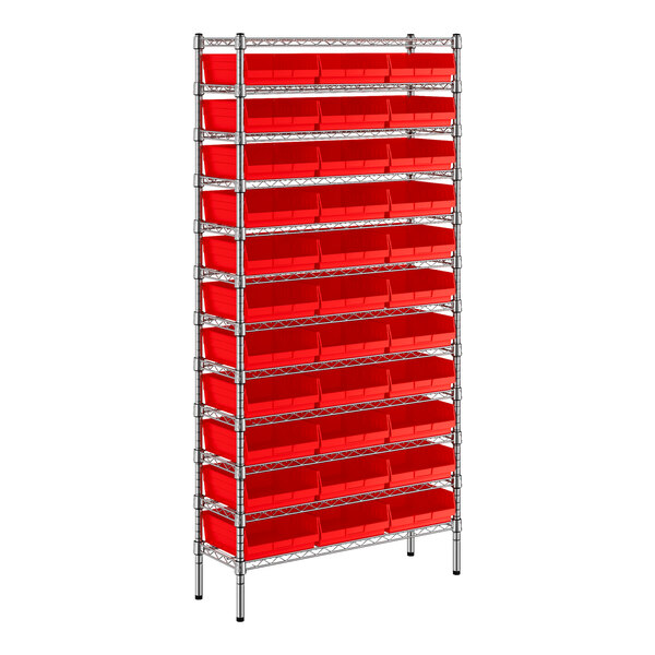 Regency 12" x 36" x 74" Wire Shelving Unit with 33 Red Bins