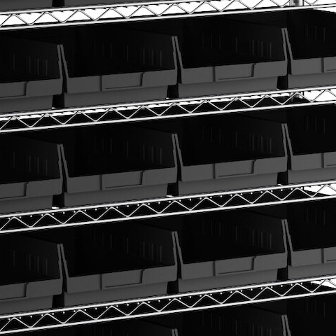 - Includes 12 shelves, 4 posts, and 44 black polypropylene bins