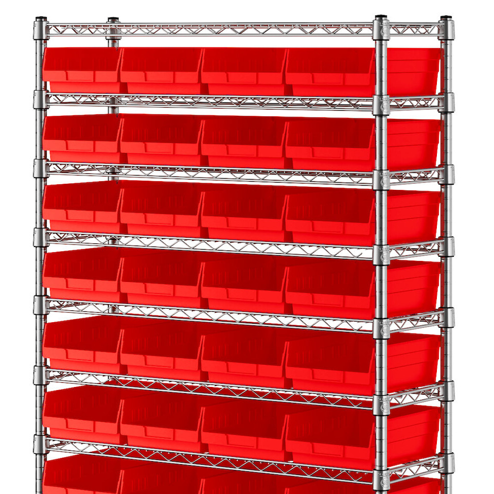 The NSF shelving unit is made of a durable, chrome-plated metal with a clear epoxy coating. It includes 12 shelves, 4 posts, and 44 red injection-molded polypropylene bins, all of which are made to commercial grade specifications to withstand industrial conditions and for your business's long-lasting use. Each shelf can hold up to an impressive 600 lb. of evenly distributed weight.