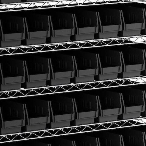- Includes 12 shelves, 4 posts, and 88 black polypropylene bins