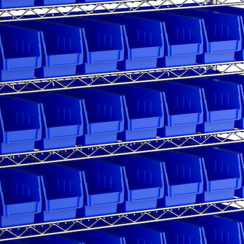 - Includes 12 shelves, 4 posts, and 88 blue polypropylene bins