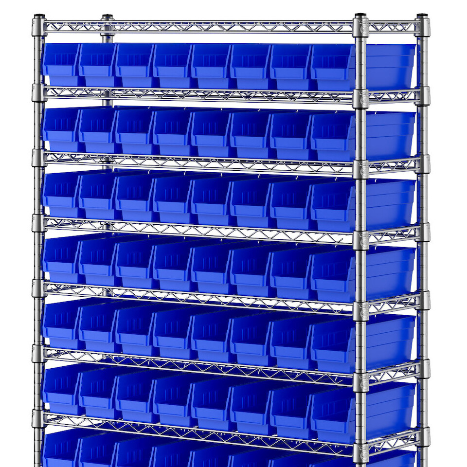 The NSF shelving unit is made of a durable, chrome-plated metal with a clear epoxy coating. It includes 12 shelves, 4 posts, and 88 blue injection-molded polypropylene bins, all of which are made to commercial-grade specifications to withstand industrial conditions and for your business's long-lasting use. Each shelf can hold up to an impressive 600 lb. of evenly distributed weight.