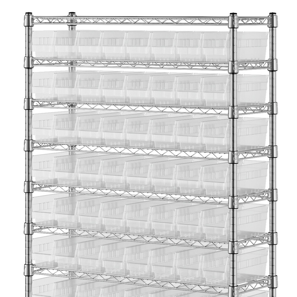 The NSF shelving unit is made of a durable, chrome-plated metal with a clear epoxy coating. It includes 12 shelves, 4 posts, and 88 clear injection-molded polypropylene bins, all of which are made to commercial-grade specifications to withstand industrial conditions and for your business's long-lasting use. Each shelf can hold up to an impressive 600 lb. of evenly distributed weight.