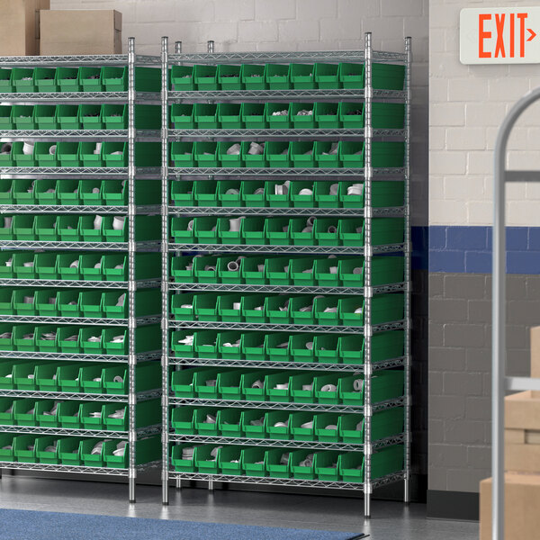 View All ItemsMaintain an organized industrial space with this Regency 12" x 36" x 74" wire shelving unit with 88 green bins.