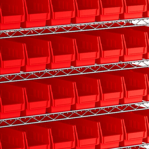 - Includes 12 shelves, 4 posts, and 88 red polypropylene bins