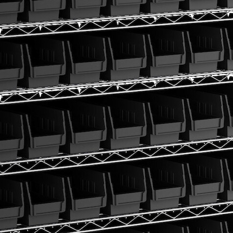 - Includes 12 shelves, 4 posts, and 110 black polypropylene bins