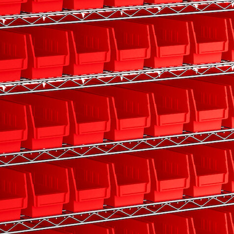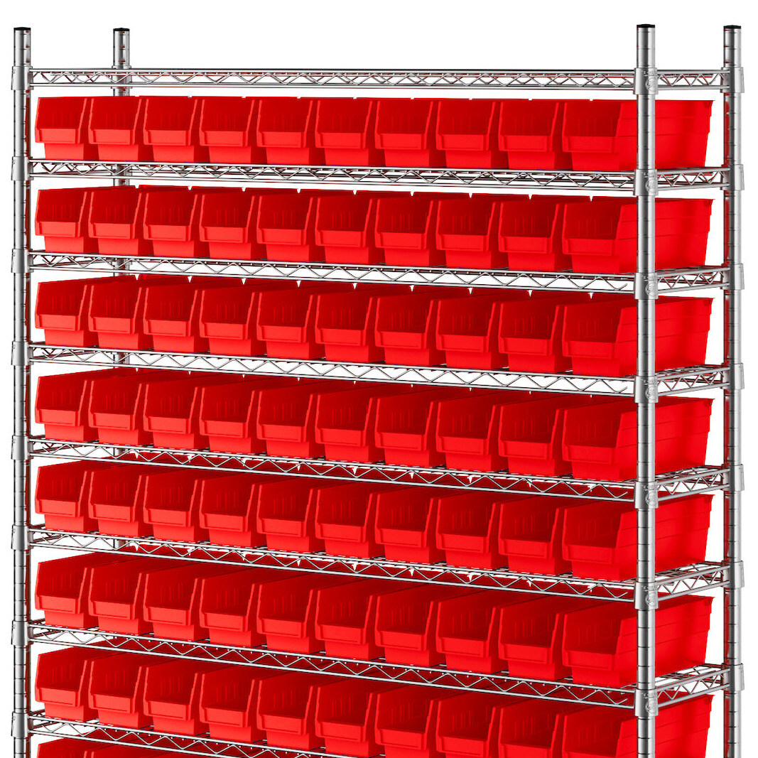 - Includes 12 shelves, 4 posts, and 110 red polypropylene bins