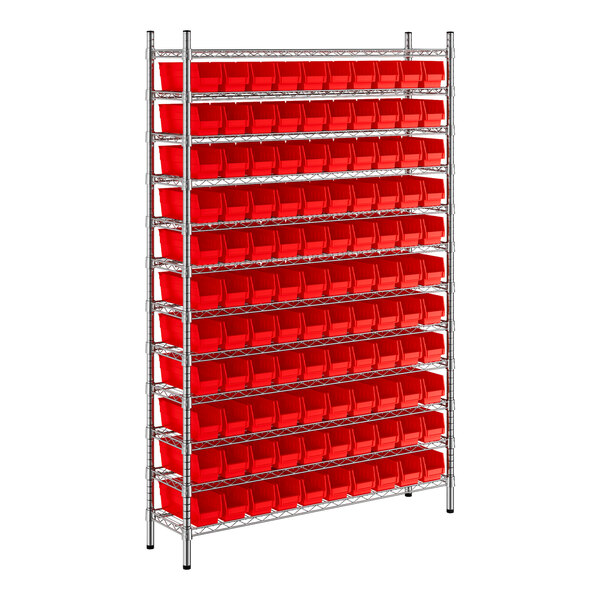 View All ItemsMaintain an organized industrial space with this Regency 12" x 48" x 74" wire shelving unit with 110 red bins.