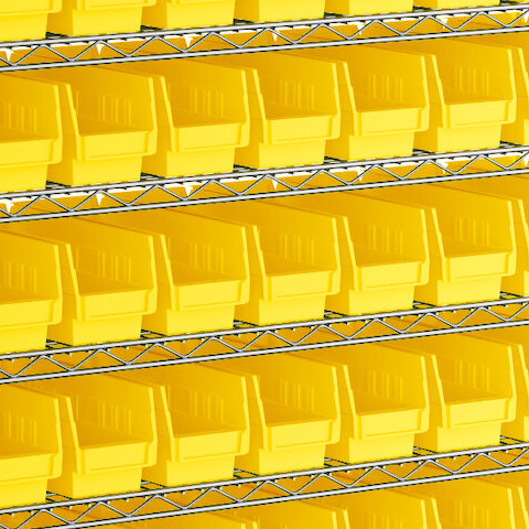 - Includes 12 shelves, 4 posts, and 110 yellow polypropylene bins