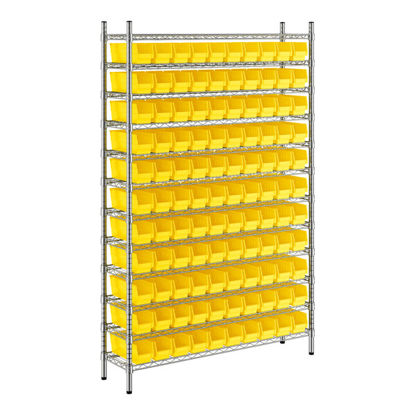 View All ItemsMaintain an organized industrial space with this Regency 12" x 48" x 74" wire shelving unit with 110 yellow bins.