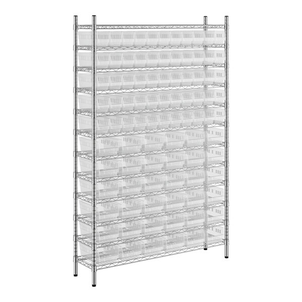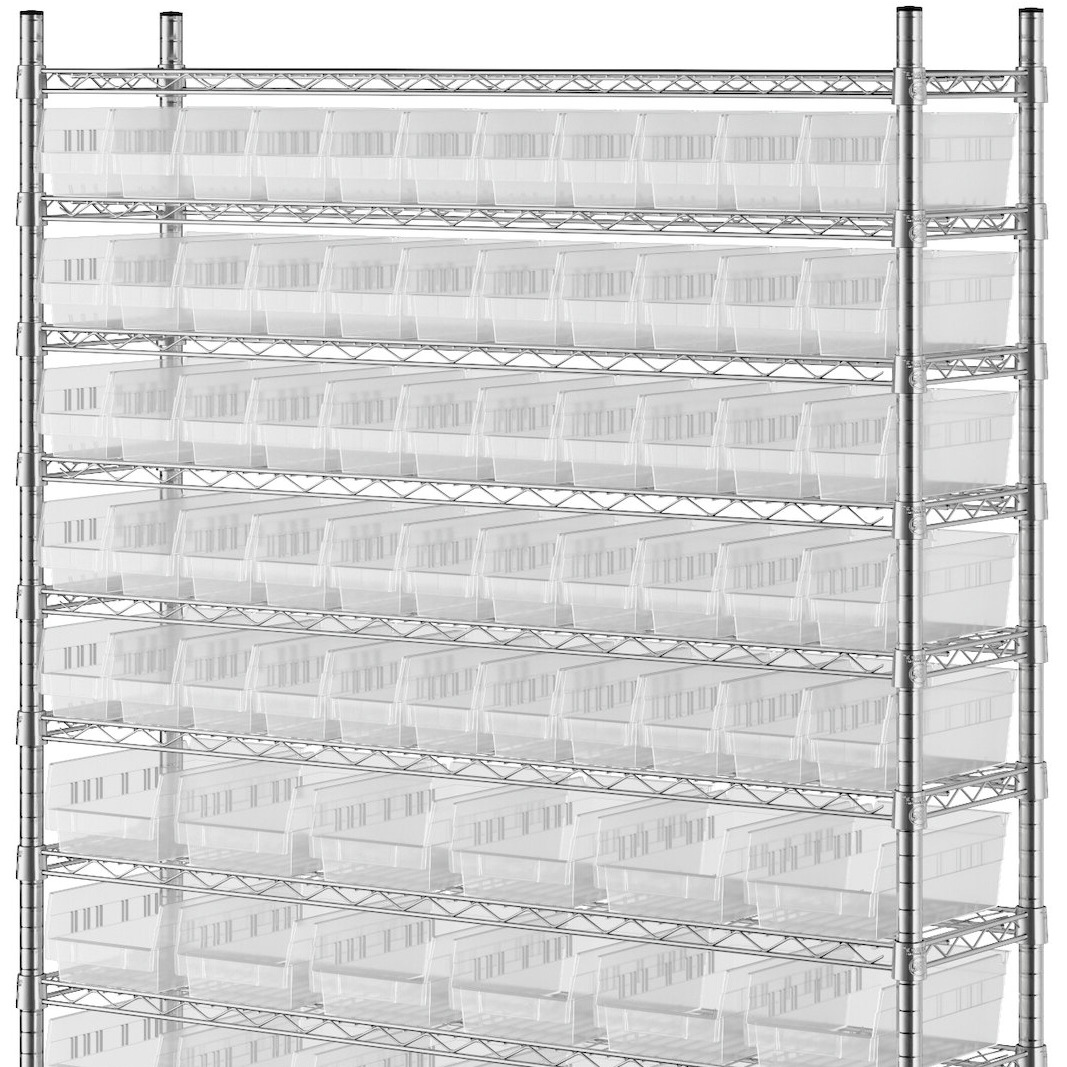 The NSF shelving unit is made of a durable, chrome-plated metal with a clear epoxy coating. It includes 12 shelves, 4 posts, and 91 clear injection-molded polypropylene bins, all of which are made to commercial-grade specifications to withstand industrial conditions and for your business's long-lasting use. Each shelf can hold up to an impressive 600 lb. of evenly distributed weight.
