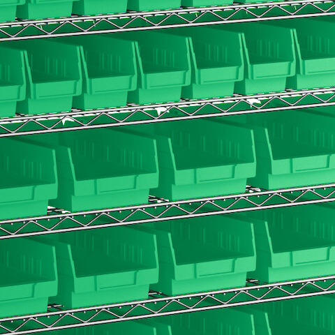 - Includes 12 shelves, 4 posts, and 91 green polypropylene bins