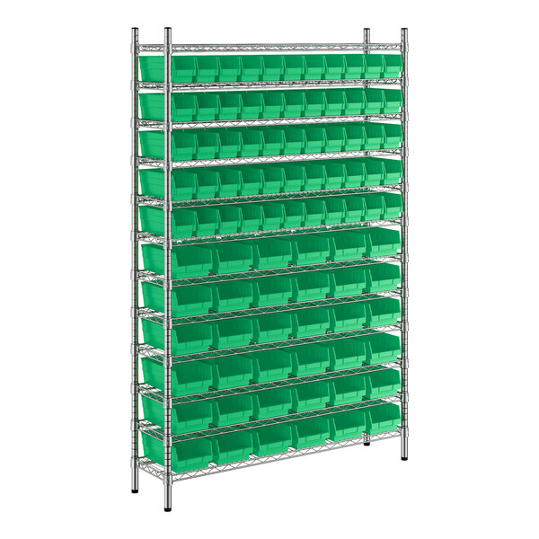 Regency 12" x 48" x 74" Wire Shelving Unit with 91 Green Bins