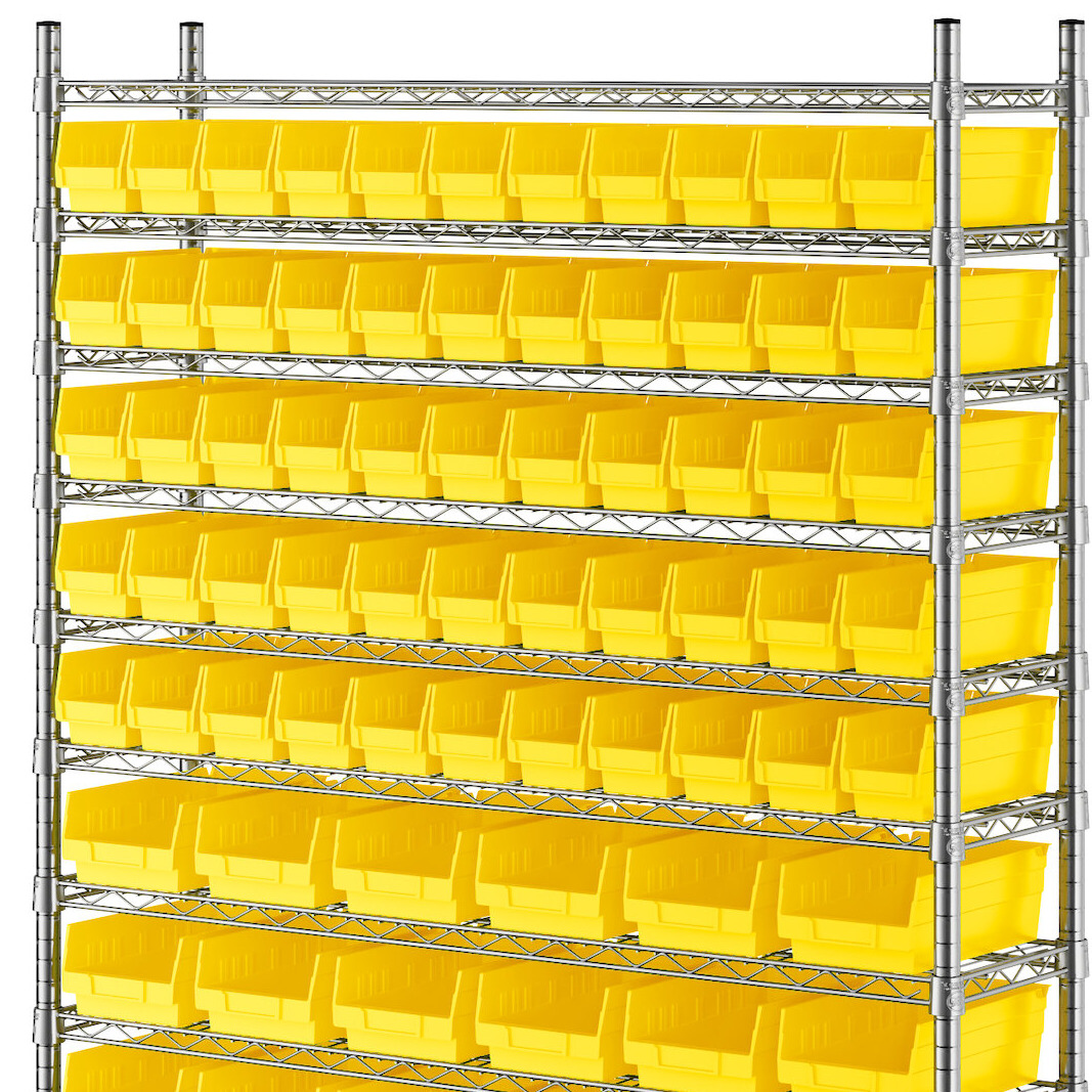 - Includes 12 shelves, 4 posts, and 91 yellow polypropylene bins